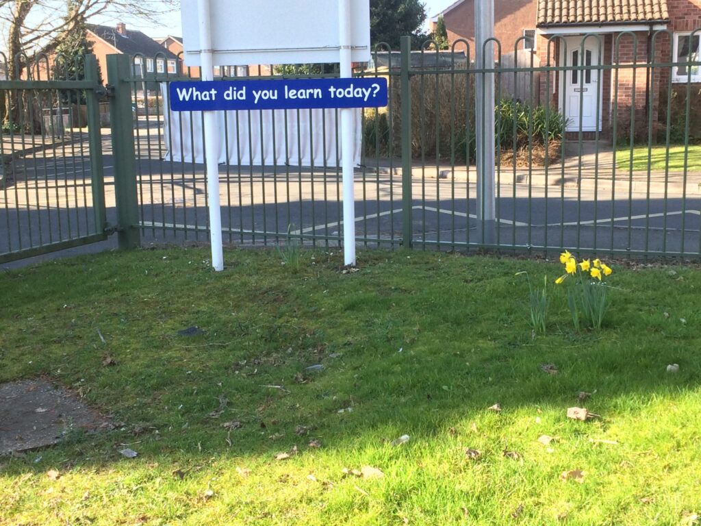 Last month I visited a primary school which stole my heart within the first five minutes. Left alone in the head teacher’s office while he went off to make some coffee, everywhere I looked brought a smile to my face. A handful of books stood on his desk within an arm’s reach of his seat and I was delighted to see Learning without Limits (Hart et al, Oxford University Press, 2004) and the Index for Inclusion (Booth & Aiscow, CSIE, 2011) among them. The wall behind me all but spoke to me, covered as it was with a large-scale concept map which turned out to be the school development plan. And outside the window, the footpath out of the school led to a small gate with an impressive sign next to it. From the outside looking in, this must have been the sign with the school’s name and maybe that of the head teacher and the caretaker. From the inside looking out, however, this was a different sign, posing a simple question to everyone as they leave: “What did you learn today?”